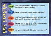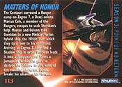| |  An episode by episode synopsis of the third season of Babylon 5. Spectacular insert sets include 9 "The Coming of Shadows" (1:10) chronicling the appearances of the sinister Shadow ships, 10 "Creators Collection" (1:10) take you behind the scenes, 50 "B-5 Trivia" (1:2), 12 "Nightwatch" Posters (1:5), 2 laser-cut B5 Logo Cards (1:48). As an added bonus, J. Michael Straczynski, the creator, writer, producer of the show, will personally autograph 1,000 cards (1:960). Insert Cards| Qty | Name | Odds |
