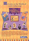 | box | Hunchback of Notre Dame | $50.00 | Add To Cart | | insert | Hunchback of Notre Dame 3-D Motion #1 (of 2) Quasimodo | $10.00 | Add To Cart | | insert | Hunchback of Notre Dame 3-D Motion #2 (of 2) Esmer | $10.00 | Add To Cart | | insert | Hunchback of Notre Dame Iron-On #1 (of 6) Quasimodo | $4.00 | Add To Cart | | insert | Hunchback of Notre Dame Iron-On #2 (of 6) Esmeralda | $4.00 | Add To Cart | | insert | Hunchback of Notre Dame Iron-On #3 (of 6) Esmeralda | $4.00 | Add To Cart | | insert | Hunchback of Notre Dame Iron-On #4 (of 6) The Three Gargoyles | $4.00 | Add To Cart | | insert | Hunchback of Notre Dame Iron-On #5 (of 6) Coat of Arms | $4.00 | Add To Cart | | insert | Hunchback of Notre Dame Iron-On #6 (of 6) Jester Skulls | $4.00 | Add To Cart | | insert | Hunchback of Notre Dame Jester's Challenge (Set of 35) | $5.00 | Add To Cart | | insert | Hunchback of Notre Dame Jester's Challenge Single | $.15 | Add To Cart | | set | Hunchback of Notre Dame 101 card set includes activity cards | $15.00 | Add To Cart | | set | Hunchback of Notre Dame Deluxe includes two sets activity cards | $17.00 | Add To Cart | |