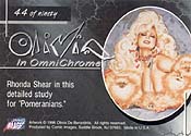 | |  Presenting the art of Olivia... in a brand new light! Fans of the country's best-loved pinup and cheesecake artist will love this 90-card portfolio of studies and finished paintings never-before-seen on cards, brought to life in the opulent effects of OmniChrome. And these treats add to the collectibility of this adult oriented series: 6 ClearChrome chase cards (~3:box), 500 Olivia Autographed cards, a rare 3-card "Sandra Taylor" subset (~1:box), an exclusive Bonus Card shrinkwrapped to every display box.
