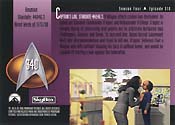 | |  A 108 card set highlighting the events and voyages of the starship USS Enterprise in its forth season on the air (1990-1191). Featuring never-before-seen digital imagery obtained from master archive sources: 2 special character profile subsets with detailed imagery and information about Geordi La Forgeand Wesley Crusher! A special nine-card mural celebrating the show's forth season; 6 randomly packed, foil-embossed cards (1:12) [S19 Klingon Communication, S20 Klingon Sash, S21 Klingon Food, S22 Soong, S23 Keiko, S24 Shelby]; 2 very limited, randomly inserted hologram cards (1:180) [HG7 Lt. Commander Geordi La Forge, HG8 Ensign Wesley Crusher]; 1 Cinema Collection and 1 Survey card.