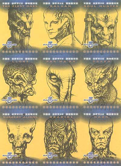 | 1 | Harlan Ellison One very limited card highlighting the career of Harlan Ellison (creative consultant for B5 and famous Sci-Fi writer). Printed on holographic prisma-foil paper and hand numbered to only 1000 Only 1000 Made | | | 18 | The Prop Cage Accenting the most memorable props used throughout the Babylon 5 series (printed on uncoated paper and gold foil stamped) | 1:4 | | 9 | The Director's Chair Announcing biographies of all the head Directors from behind the scene color-foil stamped | 1:8 | | 9 | The Optic Nerve Alien Make-up features Artist Concept Sketches on the fronts and finished Alien heads on back as created by "Optic Nerve" Studio (foil stamped on uncoated paper) | 1:12 | | | Autographs From the main cast as well as special guest stars including: Mira Furlan (Delenn), Bruce Boxleitner (Sheridan), Peter Jurasik (Londo), Bill Mummy (Lennier) and more | 1:36 |