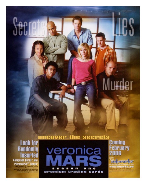 | |  Inkworks announces the release of Veronica Mars: Season One Premium Trading Cards. There's a lot going on in the town of Neptune, and it's up to Veronica and her friends to figure out what! Unlock the secrets of the show with episodic summaries, character profiles, and more in the 72-card base set. In addition to the base set, collectors have the opportunity to collect these randomly inserted bonus cards: