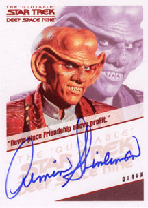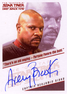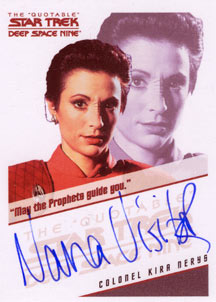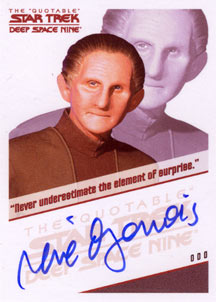 Each box of The Quotable Star Trek: Deep Space Nine comes with 1 autograph card and 2 costume cards! Cast signers include: Avery Brooks, Nana Visitor, Armin Shimerman, Terry Farrell and Rene Auberjonois on the "quotable" autograph design used in the previous two "The Quotable Star Trek" series. Also included are a bevy of guest star autographs on the fan favorite autograph card design seen in the The Complete Deep Space Nine set. These signers include