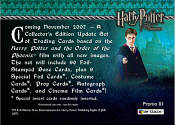 Artbox Entertainment is proud to present a new set of Harry Potter and the Order of the Phoenix Update trading cards. The set will include 90 foil stamp base cards, plus randomly inserted foil chase cards, costume cards, autographs, and more! Experience the magic of Harry Potter and the Order of the Phoenix