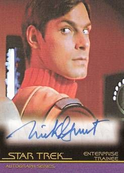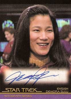Leonard Nimoy Autograph Card For every three cases purchased of Star Trek Movie In Motion Trading Cards you will receive an Exclusive Autograph Card signed by Grace Lee Whitney as CPO Janice Rand in "Star Trek: The Motion Picture". For every six cases purchased you will receive an Exclusive Autograph Card signed by Leonard Nimoy as Spock in "Star Trek: The Motion Picture".