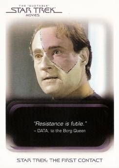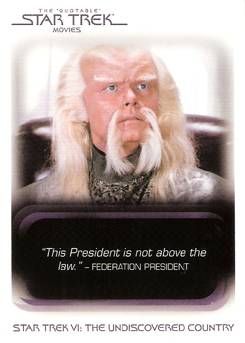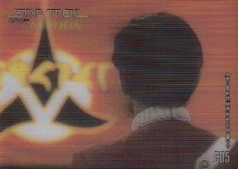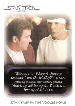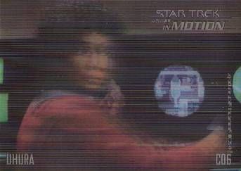 | 4 | Promo | | | 12 | Stars In Motion | 1:2 | | 10 | Quotable Star Trek Movies | 1:12 | | 29 | Autograph | 1:18 | | 16 | Portraits | 1:18 | | 1 | Case Topper Autograph | 1:case | | 1 | 3-Case Incentive Autograph | 1:3case | | 1 | 6-Case Incentive Autograph | 1:6case |