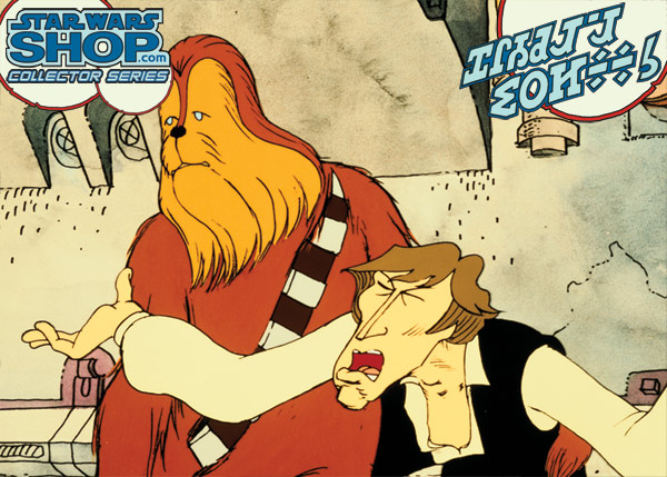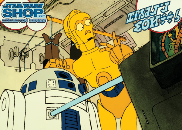There are 11 cards total, with one card being randomly inserted in all StarWarsShop orders starting today. We scoured the Lucasfilm Archives to bring you 11 images from the animated segment that have never been published (as far as we know), so these are totally unique and original collectibles -- not to mention, there's not a lot of "The Star Wars Holiday Special" to go around collectibles-wise!