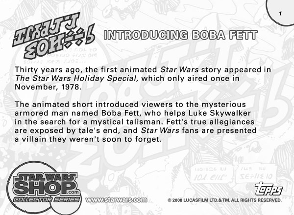 | |  In celebration of "The Star Wars Holiday Special" (or, at least the animated segment), StarWarsShop is offering an extremely limited edition series of exclusive Topps trading cards FREE to its shoppers while supplies last!