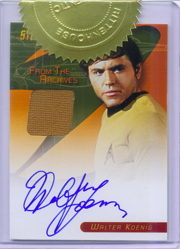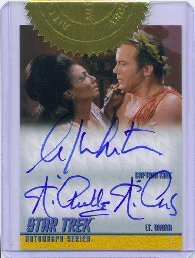 For every three cases purchased of 2009 Star Trek: The Original Series Trading Cards you will receive an Exclusive Autograph/Costume Card signed by Walter Koenig as Chekov. For every six cases purchased you will receive an Exclusive Dual Autograph Card Signed by William Shatner (Captain Kirk) and Nichelle Nichols (Uhura) in "Plato's Stepchildren"!