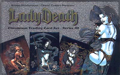 | |  Lady Death, the ravishing diva of the netherworld, returns in this prestigious 90 card chromium trading card set featuring state of the art chase card sub-sets and breathtaking artwork from Steven Hughes, Justiniano, Jim Balent, Joseph Linsner, Boris Vallejo, Joe Jusko, Jae Lee, David Mack and others. Sub-sets include the powerful "Women of Chaos!". Each pack consists of 5 Chromium cards and 1 of 90 "Mystery" Blackmask chromium cards. One oversize chromium card (4" x 6") per box. Chase card sets include: 5 Incredible Fractal Cards (1:box), 90 "Mystery" Blackmask Parallels (1:pack), 90 Clearchrome Parallels (1:box), 90 Holochrome Parallels (1:box), 90 "Mystery" Blackmask Fractal Parallels (3:box), 500 Brian Pulido / Steven Hughes Double Signed Autograph cards. Chromium 5" x 8" promo sheet.