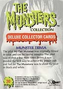 | |  Revisit television's funiest family of ghoulish monsters. See behind-the-scene photos, images from their TV show and 3 movies. This set consists of 90 cards printed on 20 pt. mirror board for that haunting effect, plus two chase card subsets consisting of 4 gold foil-stamped and 3 die-cut cards randomly inserted in packages. Production limited to 600 cases.