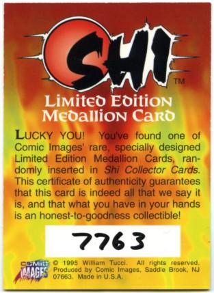 | 1 | 6-Card Strip | | | 1 | Autograph Shi creator William Tucci Only 500 Made | | | 1 | Promo | | | 6 | MagnaChrome Shi comic covers | 1:16 | | 3 | New Crusade | 1:36 | | 1 | Medallion | 1:108 | | 1 | Jumbo | 1:case |