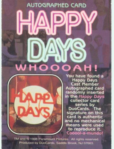 | | -auto-MarionRoss.jpg) Take one Fonz, a Richie Cunningham, and mix in all that was great about the 1950s, and what do you get? Happy Days! The #1 TV show of the 1970s premieres as a 72 collector card series, each printed on deluxe 24pt. stock. Relive 11 great seasons with nostalgic subsets including cast bios, where they are now, guest appearances, and more! Special chase cards include 6 rare "The Fonz" Chromium cards, autograph cards from Henry Winkler and Marion Ross cards, and a special surprise bonus in every case!