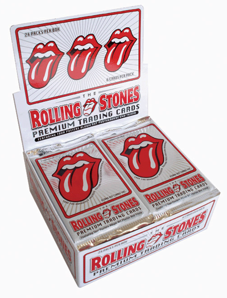 | |  One full box of factory sealed Rolling Stones premium trading cards featuring classic tour posters, album art, rare photographs and trivia spanning over 40 years of rock and roll history. Each pack contains six officially licensed cards and one temporary tattoo. Bonus pack inserts include randomly placed Rolling Stones guitar picks (1:6); satin sticker cards (1:8); and holographic glitter-foiled tongue cards (1:12). A respectable 150 card base set complete with 6 different chase cards printed on a bright white, 20 point stock and coated with a high gloss UV finish. Comes 24 packs to a box. Insert Cards| Qty | Name | Odds |