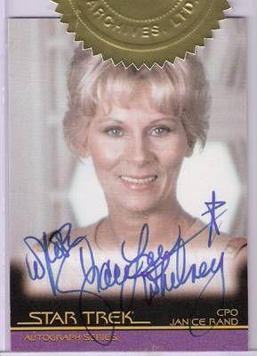 Leonard Nimoy Autograph Card For every three cases purchased of Star Trek Movie In Motion Trading Cards you will receive an Exclusive Autograph Card signed by Grace Lee Whitney as CPO Janice Rand in "Star Trek: The Motion Picture". For every six cases purchased you will receive an Exclusive Autograph Card signed by Leonard Nimoy as Spock in "Star Trek: The Motion Picture".