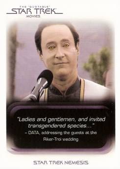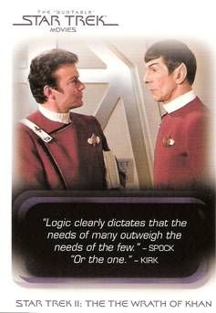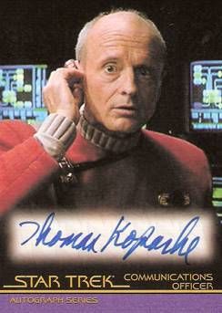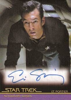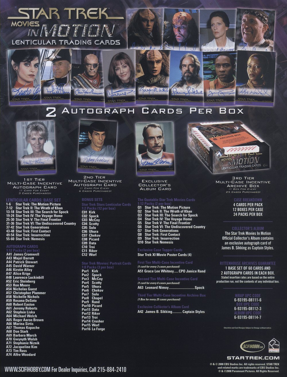 | 4 | Promo | | | 12 | Stars In Motion | 1:2 | | 10 | Quotable Star Trek Movies | 1:12 | | 29 | Autograph | 1:18 | | 16 | Portraits | 1:18 | | 1 | Case Topper Autograph | 1:case | | 1 | 3-Case Incentive Autograph | 1:3case | | 1 | 6-Case Incentive Autograph | 1:6case |