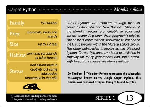 This set is the first release from Diamondback Trading Cards and the base set for all future 'Reptiles' releases. It contains 50 unique cards depicting Snakes, Lizards and Turtles/Tortoises from around the world.